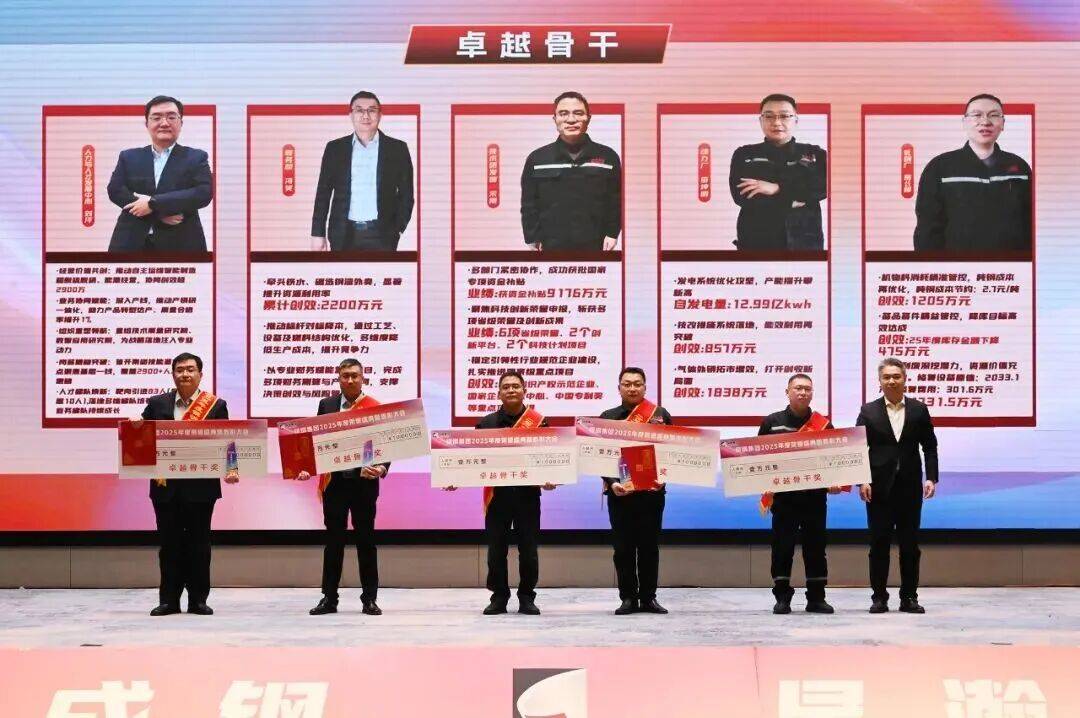 卓越骨干奖:刘洋、冯笑、宋刚、田坤明、葛长峰,他们在管理岗位上,分别有力推动或深度参与了组织与研究院重组、资源外卖与财务测算、国家级资质与资金申报、发电系统优化与气体外销、吨钢成本节约与修旧利废等重点管理或创效项目。