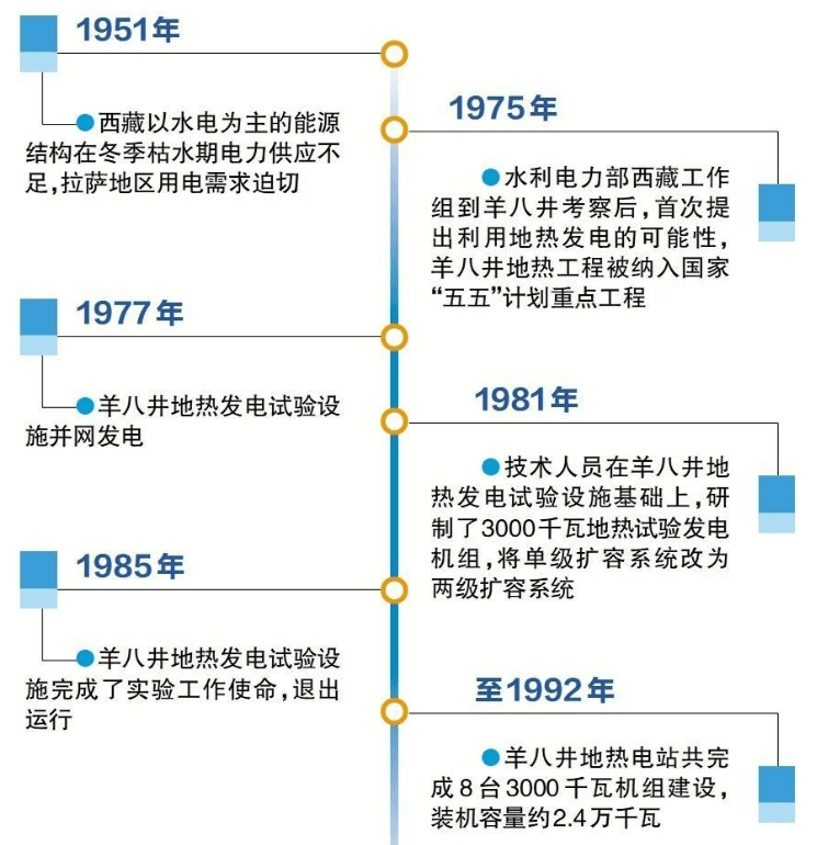 1978年,羊八井地热发电试验设施运行初期曾因汽轮机振动过大、地热井结垢等问题时开时停。水利电力部专家组研发空心机械通井装置,解决了结垢难题;通过动平衡试验,消除了振动隐患,让机组实现长期稳定运行。