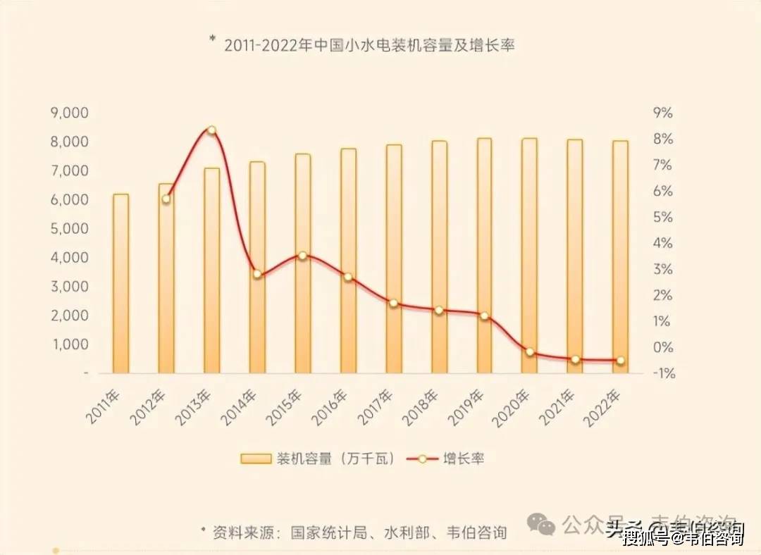 图表9:2011-2022年中国小水电装机容量变化及增长率趋势(万千瓦,%)